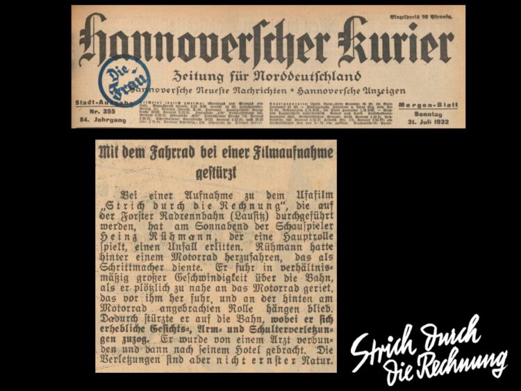 Bei einer Aufnahme zu dem Ufafilm „Strich durch die Rechnung“, die auf der Forster Radrennbahn (Lausitz) durchgeführt werden, hat am Sonnabend der Schauspieler Heinz Rühmann, der eine Hauptrolle spielt, einen Unfall erlitten. Rühmann hatte hinter einem Motorrad herzufahren, das als Schrittmacher diente. Er führ in verhältnismäßig großer Geschwindigkeit über die Bahn, als er plötzlich zu nahe an das Motorrad geriet, das vor ihm her fuhr, und an der hinten am Motorrad angebrachten Rolle hängen blieb. Dabei stürzte er auf die Bahn, wobei er sich erhebliche Gesichts-, Arm- und Schulterverletzungen zuzog. Er wurde von einem Arzt verbunden und dann nach seinem Hotel gebracht. Die Verletzungen sind aber nicht von ernster natur.